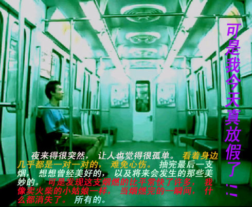 我是在蓝村路4号线进入地铁的。到底是下面凉快,真是上面是地狱下面是天堂啊。所以,没有什么事情可以做的乞丐在这天堂里,也空前的多,以各式各样的姿势像这个城市展示一片风景。不过我没有给他们钱,因为我觉得我和他们几乎是没有什么区别的,搞不好我也会和他们一起说那句“同是天涯沦落人”。哎,实在是不忍心看了,也不忍心听转口处的那个瞎子拉着不知是不是跑调的二胡,又下了一层。
